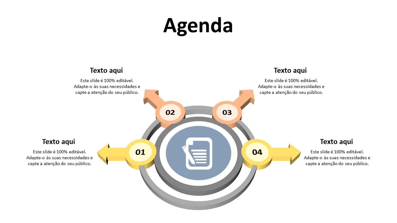 Uma Agenda Ppt Ideas projetada profissionalmente para apresentações em reuniões. Slides editáveis com design moderno, ideais para profissionais de negócios, consultores e equipes. Layout limpo pronto para personalizar.