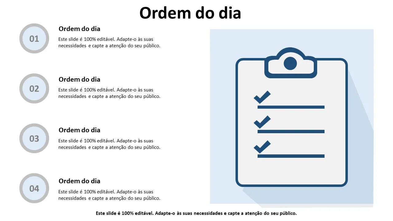 Tópicos de Ppt da Agenda projetados profissionalmente para apresentações em reuniões. Slides editáveis com design moderno, ideais para profissionais de negócios, consultores e equipes. Layout limpo pronto para personalizar.