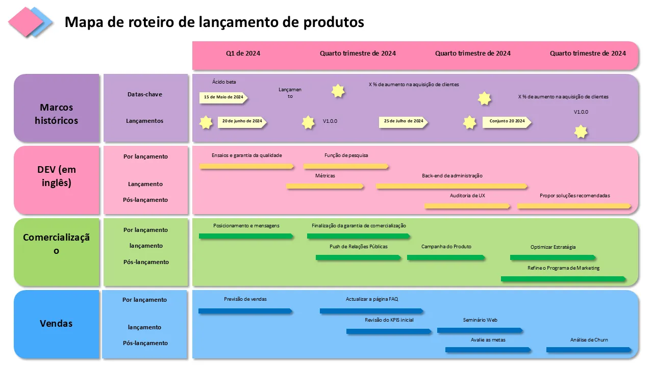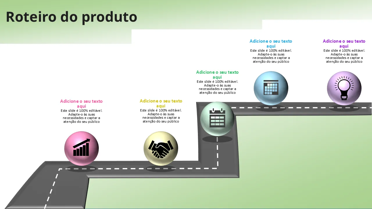 Um roteiro de produto dinâmico com ideias em PowerPoint projetadas para gerentes de produto e equipes de desenvolvimento. Ideal para estratégias de lançamento, roteiros de produtos e planejamento de entrada no mercado. Editável e pronto para apresentação.