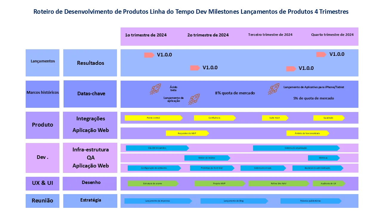 Um cronograma dinâmico de entrega de produtos com KPI e marketing projetado para gerentes de produto e equipes de desenvolvimento. Ideal para estratégias de lançamento, roteiros de produtos e planejamento de entrada no mercado. Editável e pronto para apresentação.