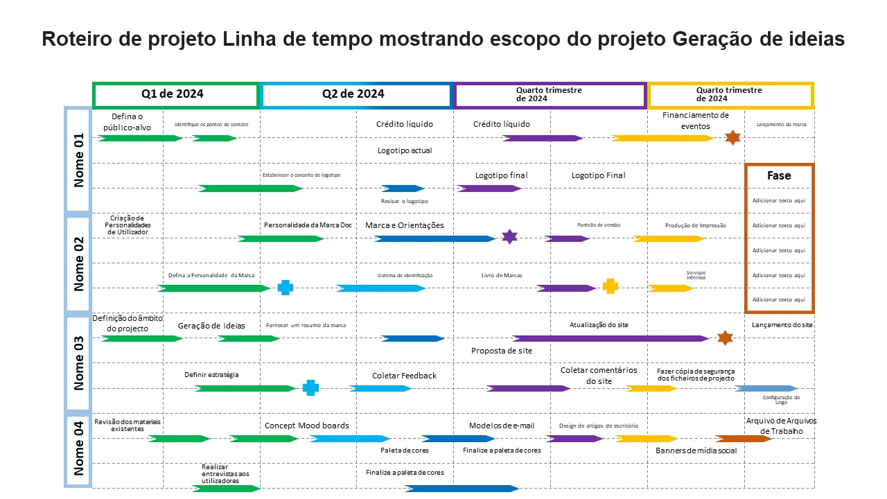 Visualize o escopo do projeto e os cronogramas de geração de ideias com este modelo profissional do PowerPoint. Perfeito para planejamento estratégico, desenvolvimento de roadmap e alinhamento de equipe.