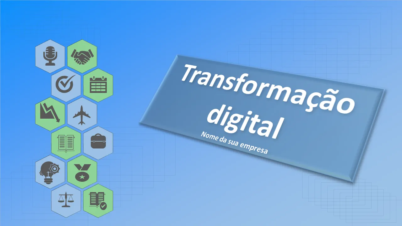 Modelo profissional de PowerPoint para estratégia de transformação digital. Ideal para líderes empresariais, consultores e executivos que apresentam planos de adoção de tecnologia, mudanças organizacionais e crescimento orientado por análises.