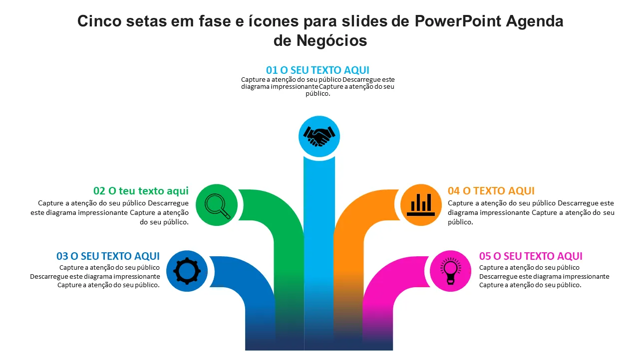 Cinco setas e ícones encenados para slides em Powerpoint da agenda de negócios
