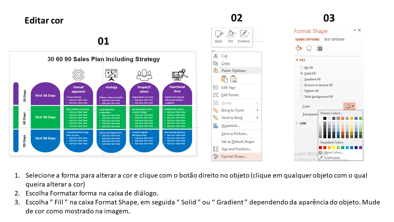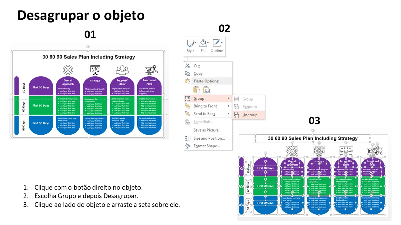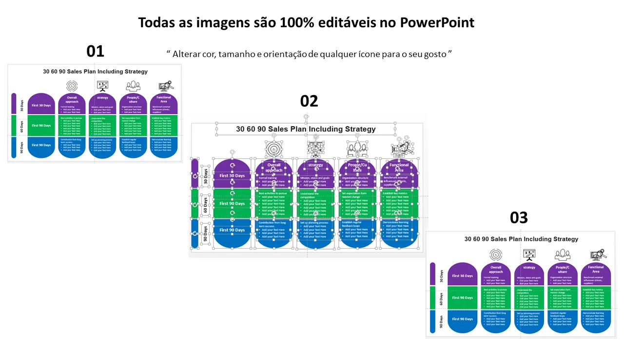 - Três seções distintas de fases para planejamento de 30, 60 e 90 dias