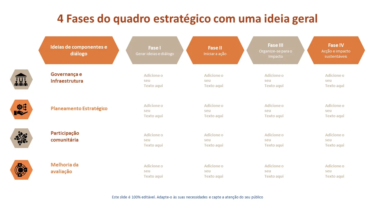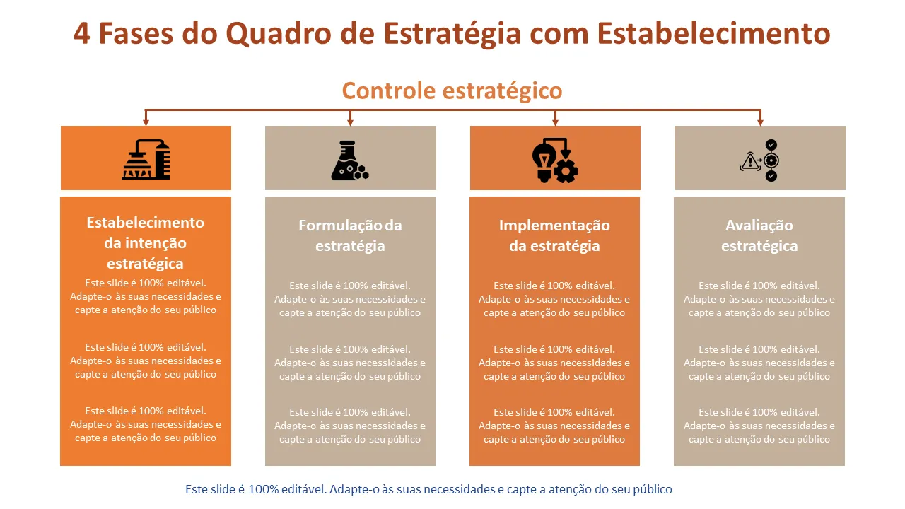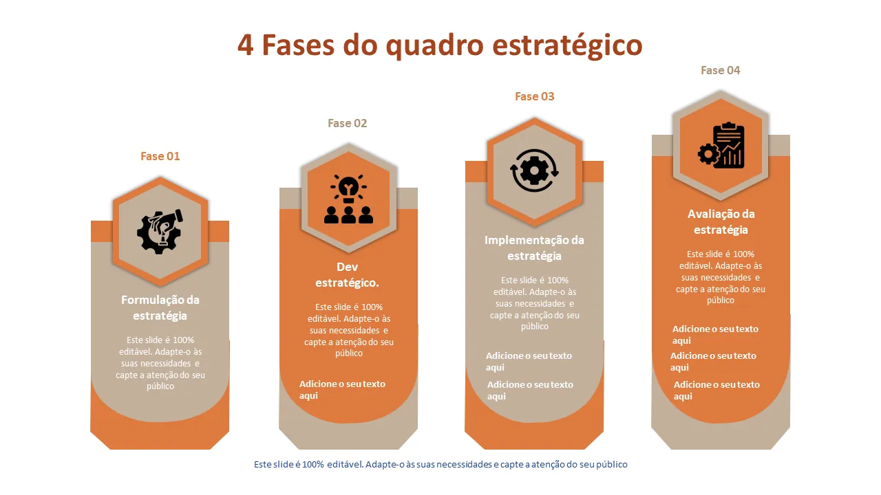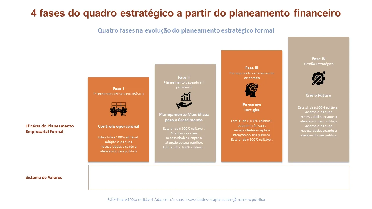 - Layout pré-projetado para cada uma das quatro fases estratégicas com hierarquia visual consistente