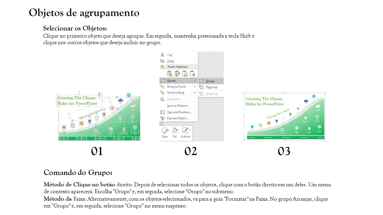 - Orientação passo a passo sobre agrupamento e desagrupamento de objetos para edição avançada