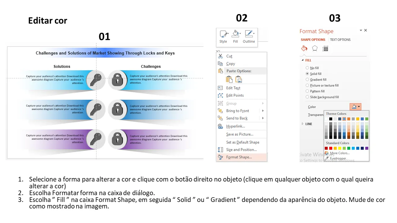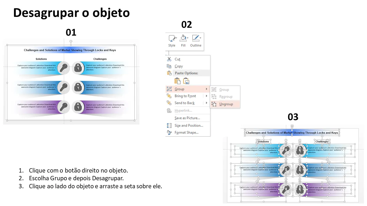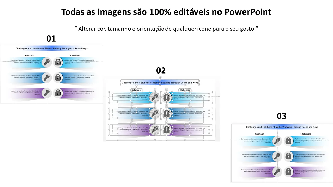 - Layouts de slides personalizáveis para apresentar desafios e soluções específicas