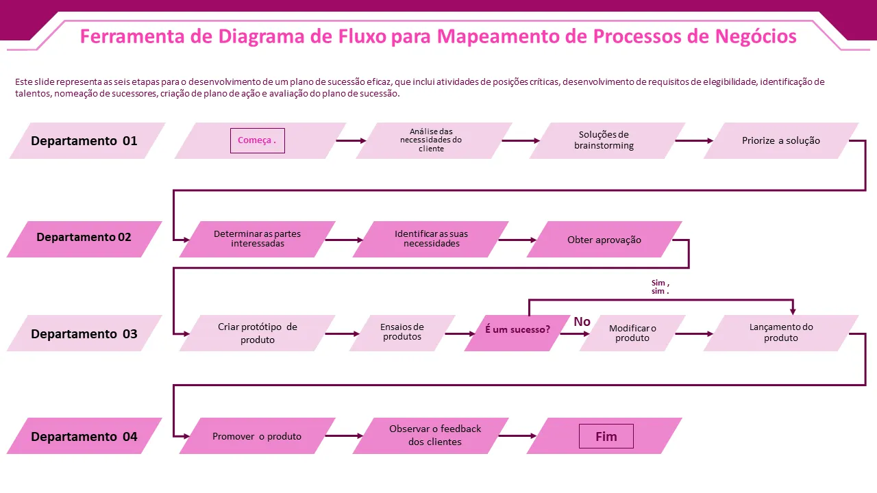Equipes de manufatura, logística, saúde e finanças usam este modelo para alinhar operações com objetivos estratégicos. Os gerentes de RH e de operações se beneficiam de sua abordagem estruturada para mapeamento de processos e alinhamento de talentos. Os executivos aproveitam-no durante auditorias internas, iniciativas de gestão de mudanças ou workshops multifuncionais para aumentar a eficiência e reduzir os tempos de ciclo. Também é adequado para sessões de treinamento e projetos de melhoria de processos em que as partes interessadas precisam visualizar e concordar com novos fluxos de trabalho.