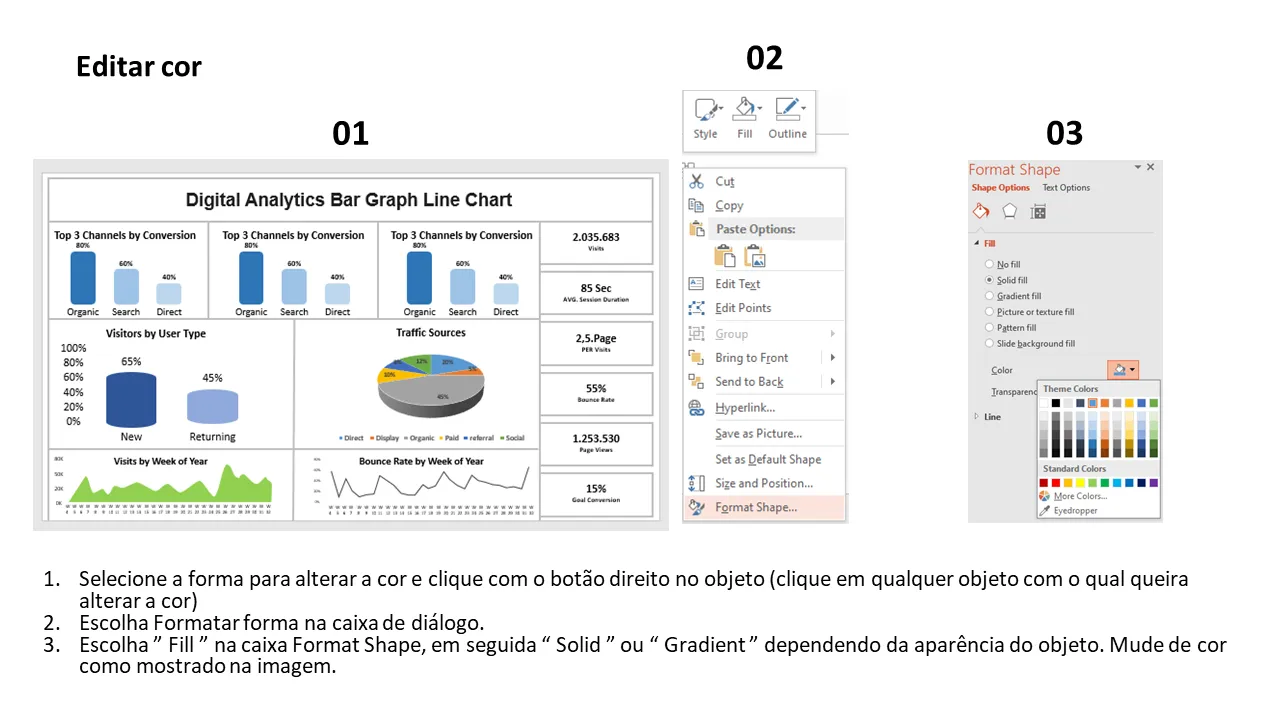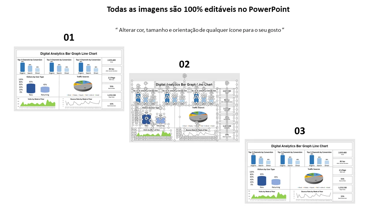 Este modelo do PowerPoint foi projetado para ajudar os usuários a visualizar as principais métricas de desempenho digital usando gráficos de barras e gráficos de linhas simples. É ideal para apresentar insights baseados em análises sobre estratégia de negócios, desempenho de marketing e análises operacionais. O modelo oferece suporte à narrativa de dados com visualizações intuitivas que destacam tendências, crescimento e comparações.