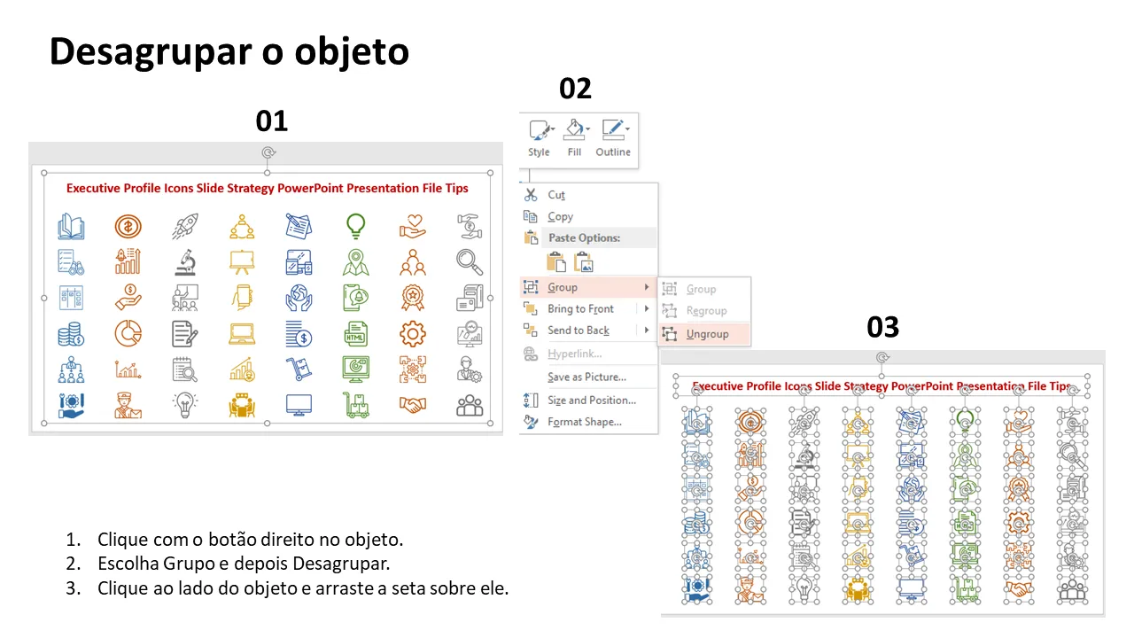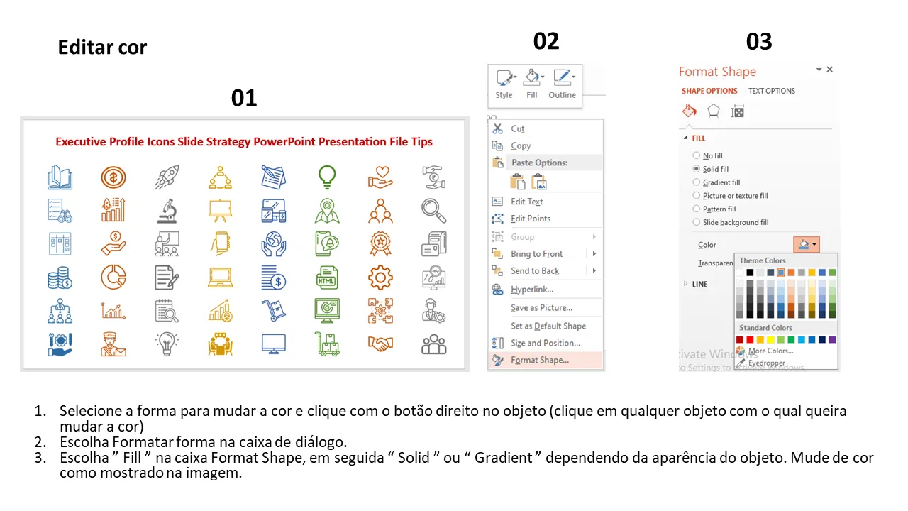 Características de Ícones de perfil executivo Estratégia de slides Dicas para arquivos de apresentação em PowerPoint