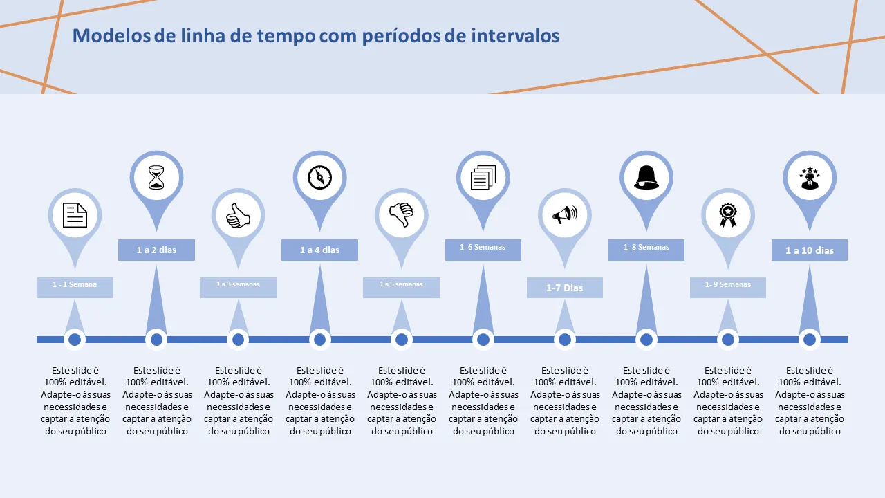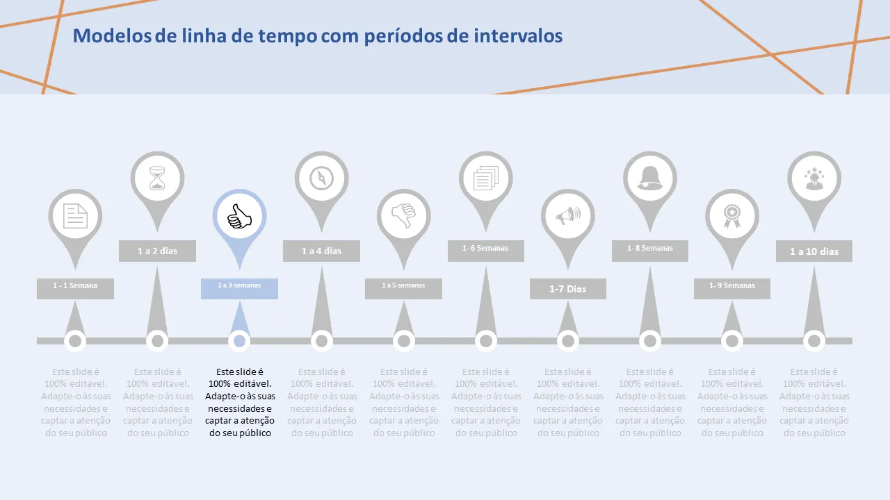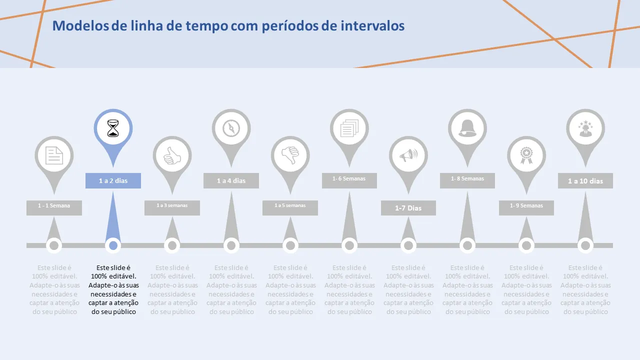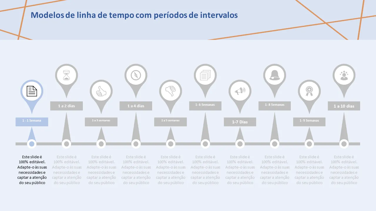 Este modelo profissional do PowerPoint foi projetado para ajudar as equipes a visualizar cronogramas, marcos e execução em fases do projeto com lacunas integradas e marcadores de período. Ele oferece suporte ao planejamento estratégico, permitindo aos usuários mapear estágios de projetos de várias semanas ou vários dias com clareza visual. O modelo é ideal para gerentes de projetos, equipes de produtos e executivos que precisam comunicar cronogramas de maneira eficaz entre os departamentos.