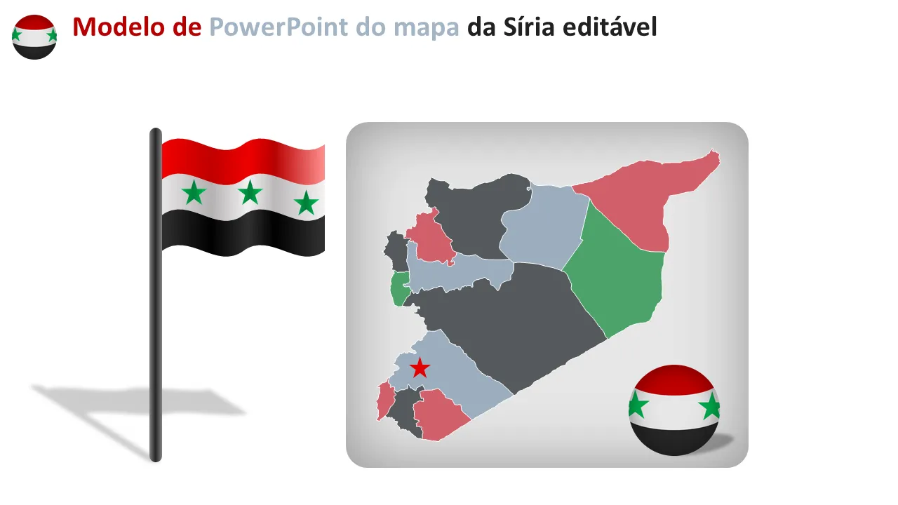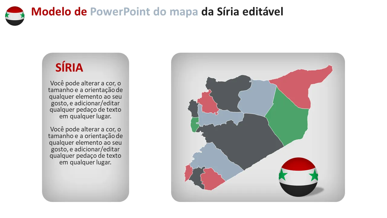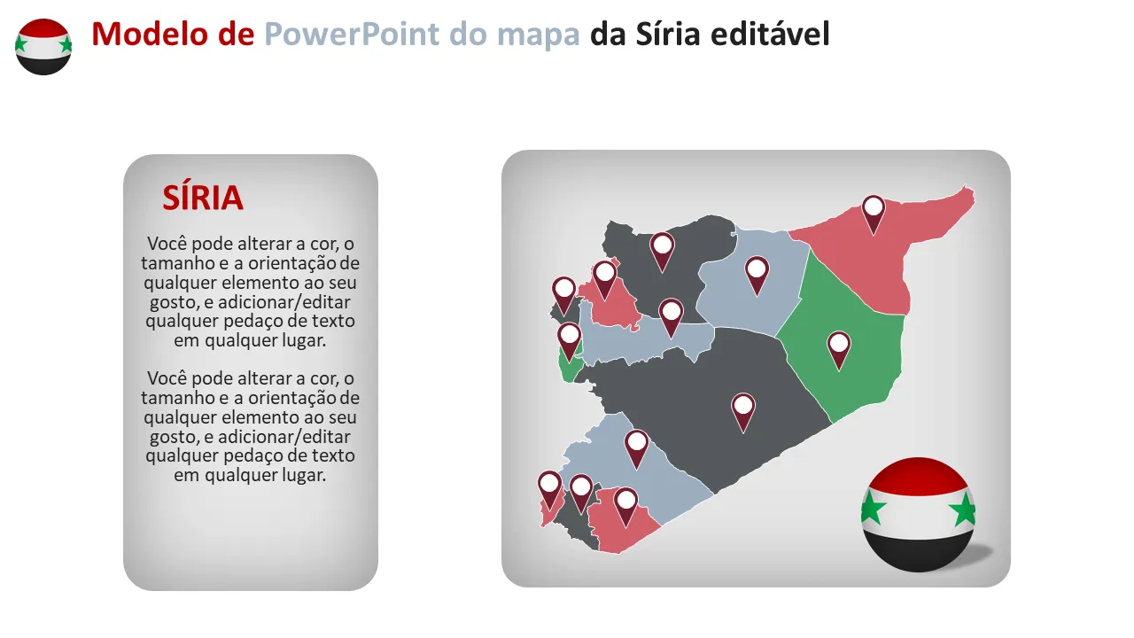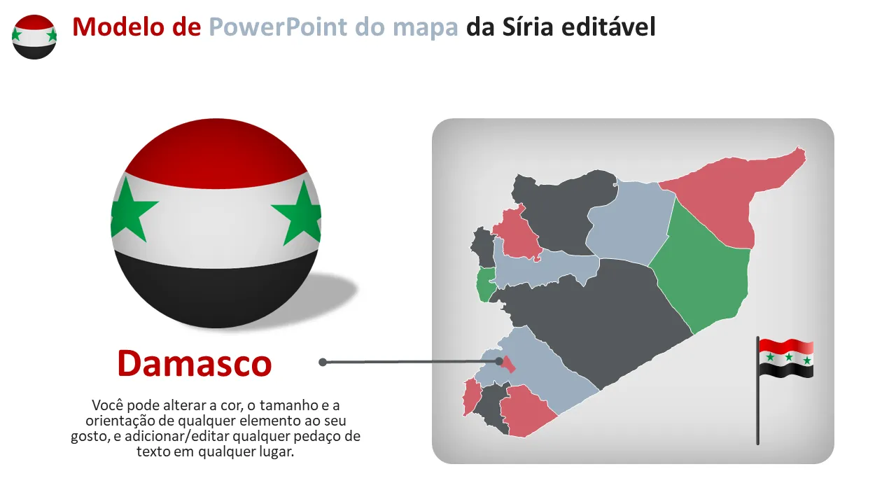 Analistas de negócios, consultores e estrategistas regionais usam este modelo para apresentar resultados de pesquisas de mercado, mapas de segmentação de clientes ou logística da cadeia de suprimentos na Síria. É especialmente útil para ONGs, empresas internacionais e agências governamentais que trabalham na região. Os executivos que preparam atualizações para investidores ou apresentações de estratégia corporativa se beneficiam de seu layout limpo e estética profissional.