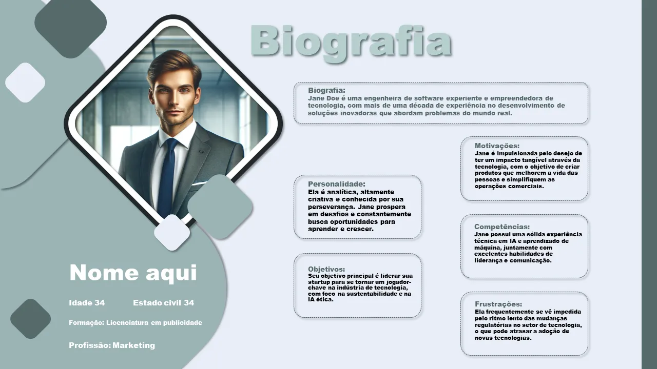Profissionais de negócios, gerentes de RH e fundadores de startups usam este modelo para apresentar membros da equipe, destacar biografias de liderança ou apresentar jornadas de carreira pessoais. Funciona bem em ambientes corporativos, organizações sem fins lucrativos e instituições educacionais. Ideal para uso em relatórios anuais, sites de empresas ou materiais de treinamento interno onde uma aparência elegante e consistente é essencial.