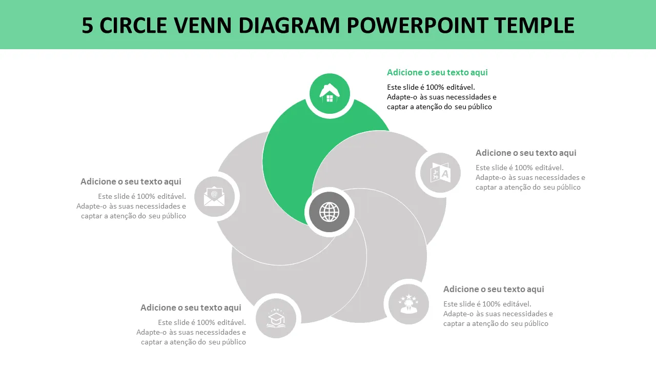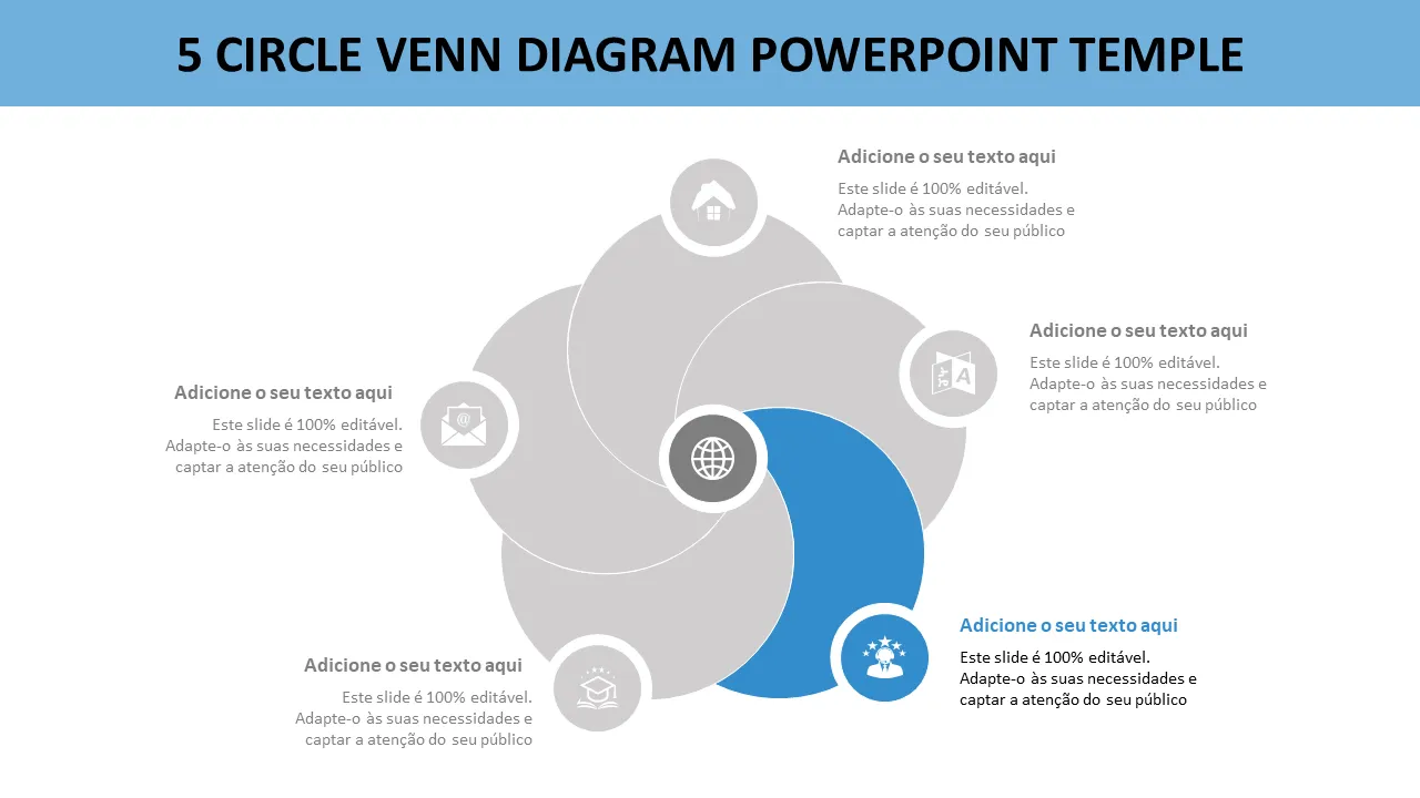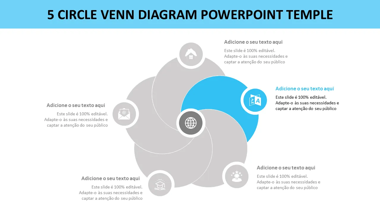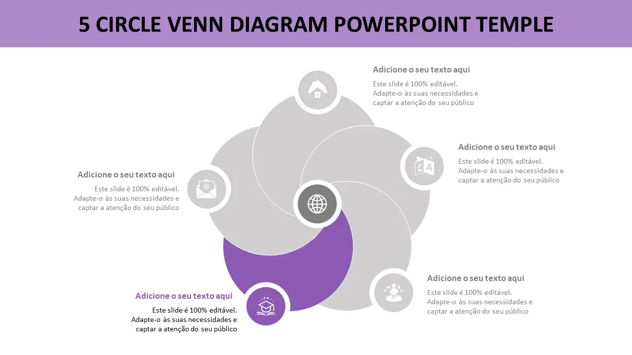 FAQ - Modelo de Powerpoint de Diagrama de Venn de 5 Círculos