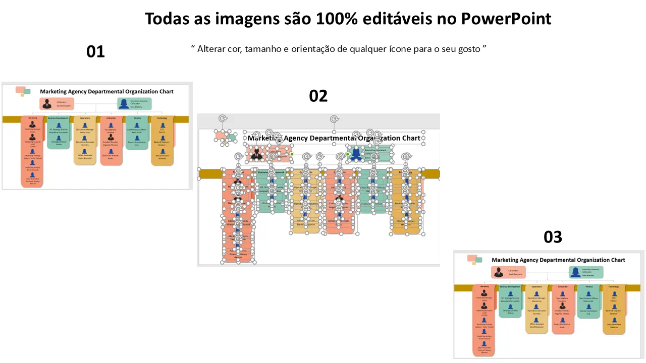 Características de Modelo de PowerPoint de organograma departamental de agência de marketing para apresentações profissionais