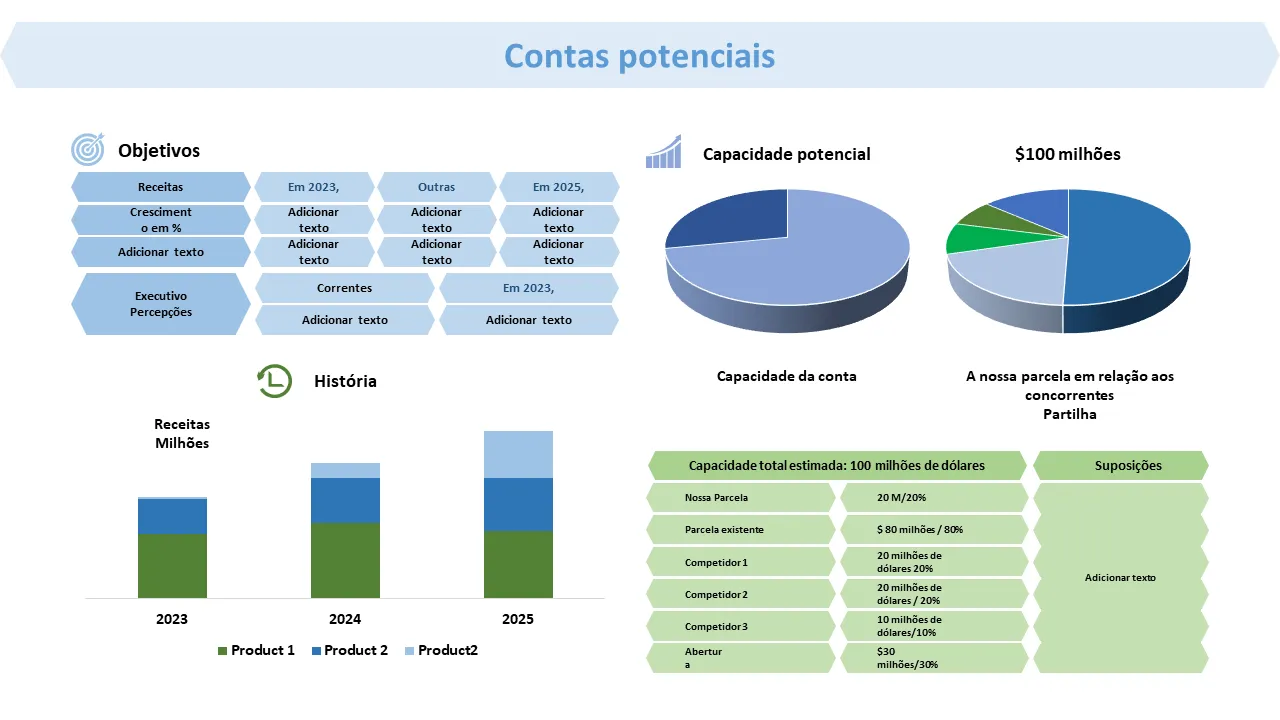 Este modelo profissional de PowerPoint foi projetado para orientar os usuários através do planejamento estratégico e execução de iniciativas baseadas em contas. Construído em torno de estruturas básicas como potencial de conta, análise de cenário e etapas acionáveis, ele ajuda as equipes a visualizar e priorizar o envolvimento do cliente. Ideal para consultores, líderes de vendas e estrategistas de negócios, ele oferece suporte à tomada de decisões estruturadas e a resultados mensuráveis.