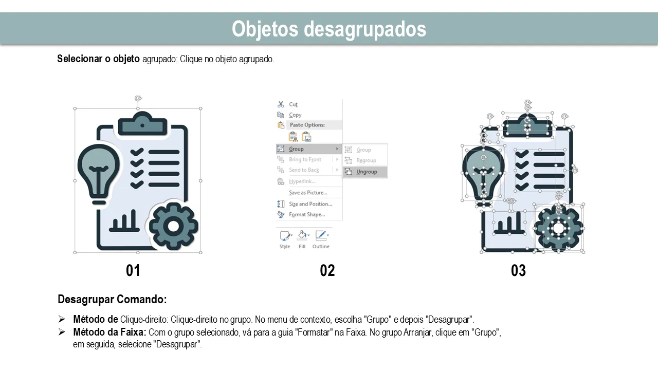 - Elementos visuais e marcadores de conteúdo específicos de cada tópico
