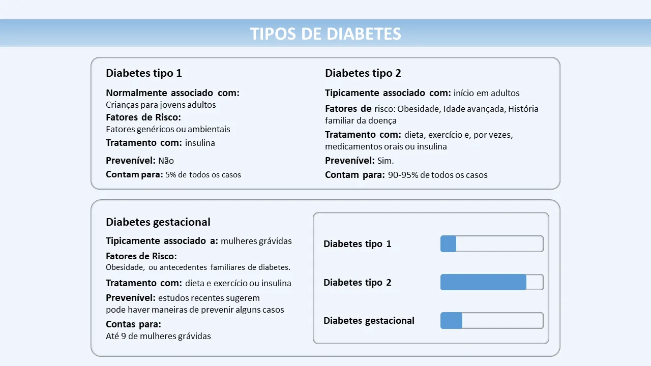 - Slides visualmente estruturados que cobrem sintomas, causas e prevenção do diabetes