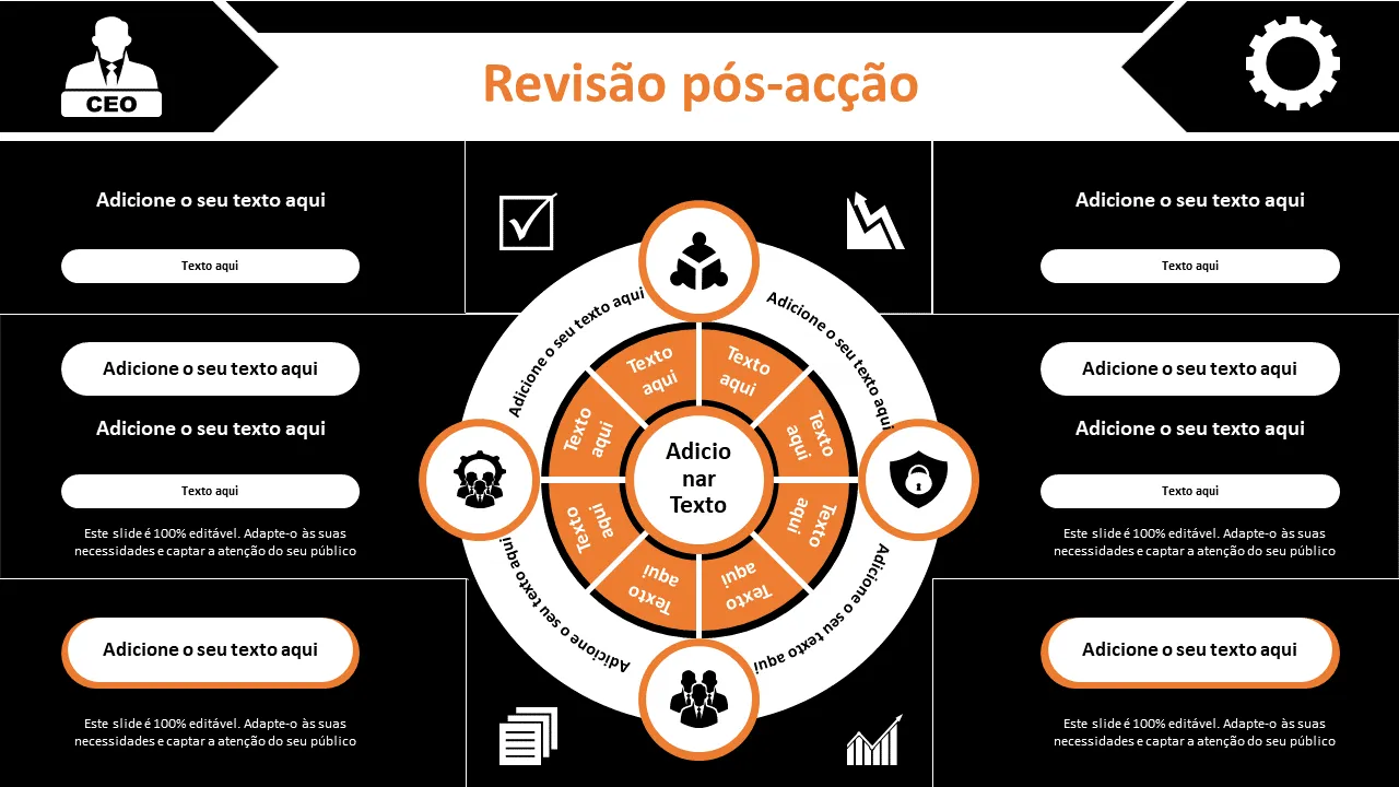 Este modelo PowerPoint de revisão pós-ação foi projetado para ajudar equipes e executivos a avaliar sistematicamente iniciativas anteriores, capturar insights importantes e traduzir lições em melhorias viáveis. Criado para estratégia de negócios e revisão operacional, ele apoia a reflexão estruturada e a tomada de decisões entre departamentos e níveis de liderança. O modelo promove a melhoria contínua alinhando o feedback com metas estratégicas e métricas de desempenho.