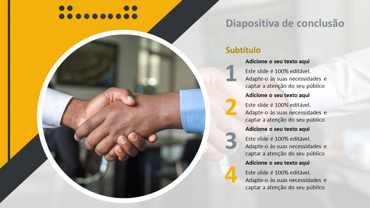 Profissionais de negócios usam este modelo para concluir apresentações a investidores, sessões de planejamento estratégico e análises corporativas. Funciona especialmente bem em ambientes financeiros, de consultoria e de startups, onde a mensagem final é importante. Executivos, gerentes de projeto e líderes de marketing se beneficiam de sua estrutura limpa e tom profissional. Também é útil para atualizações de equipes internas, análises de clientes e resumos executivos de setores como fintech, saúde e startups de tecnologia.