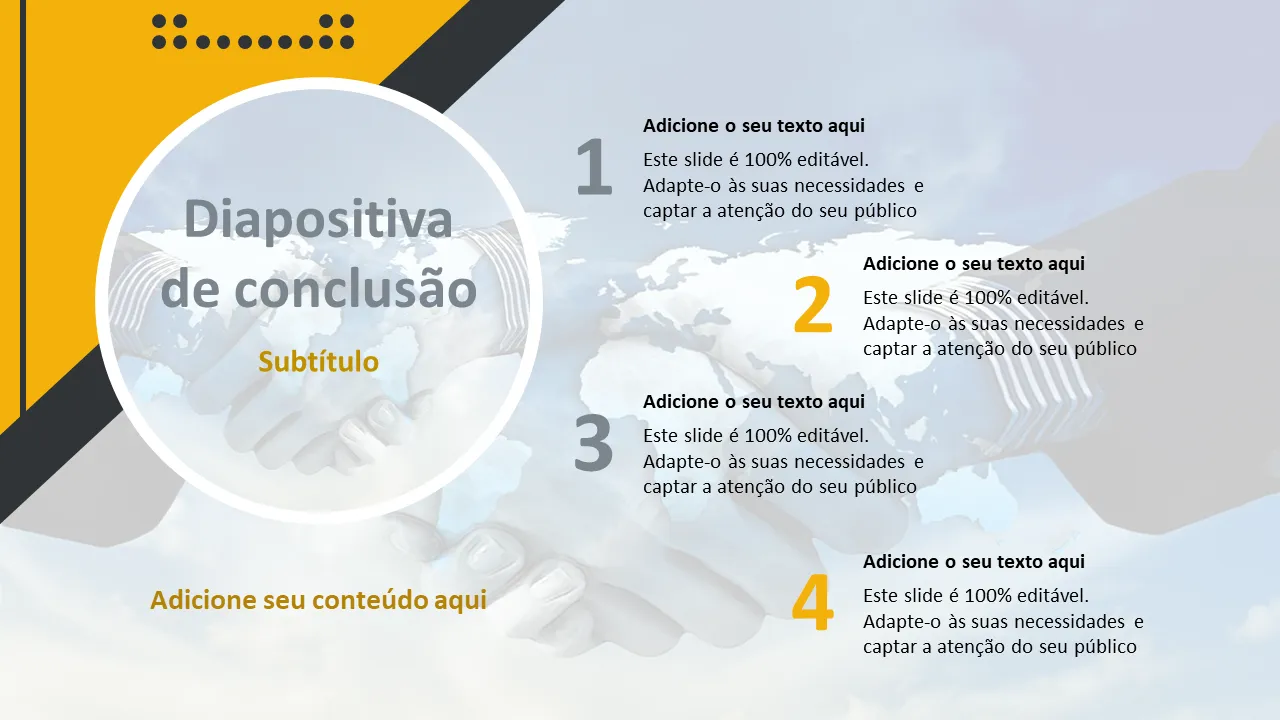 Este modelo de slide de conclusão sofisticado foi criado para ajudar os apresentadores a transmitir uma mensagem de encerramento forte em qualquer ambiente profissional. Projetado com clareza e impacto visual em mente, ele oferece suporte a mensagens estratégicas e reforça as principais conclusões. Ideal para líderes empresariais, consultores e executivos que precisam finalizar apresentações com autoridade e precisão.