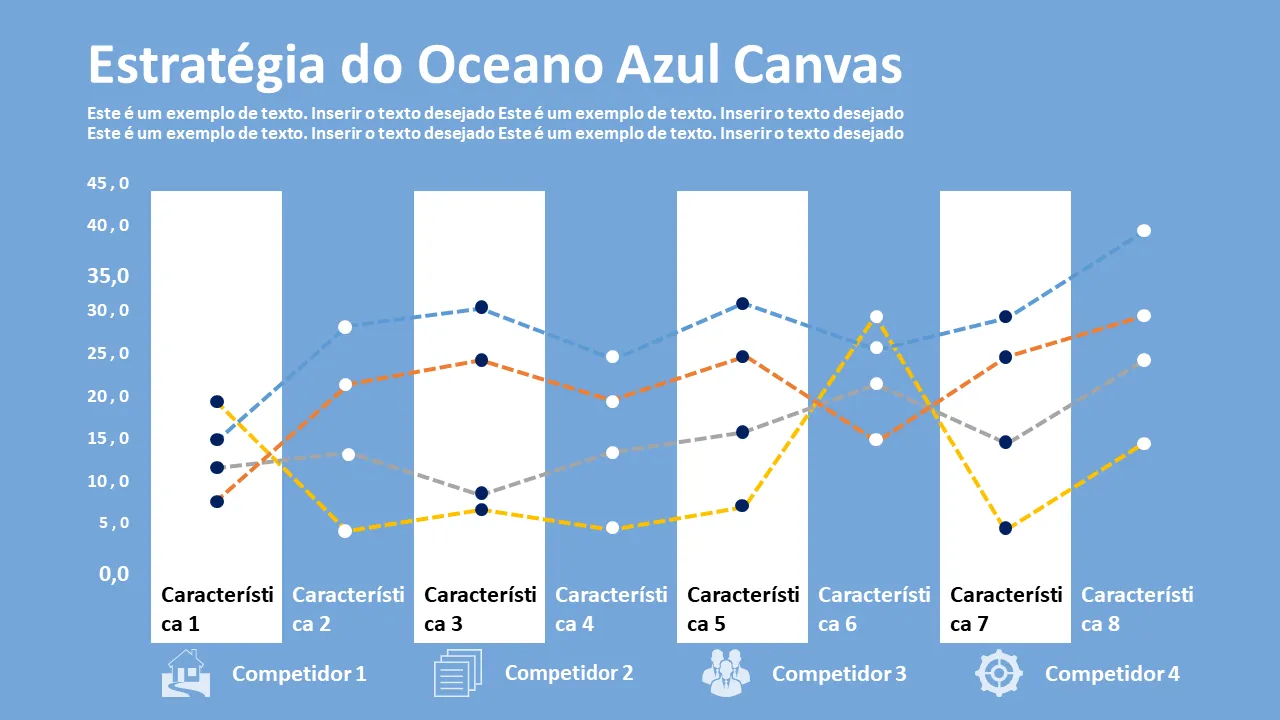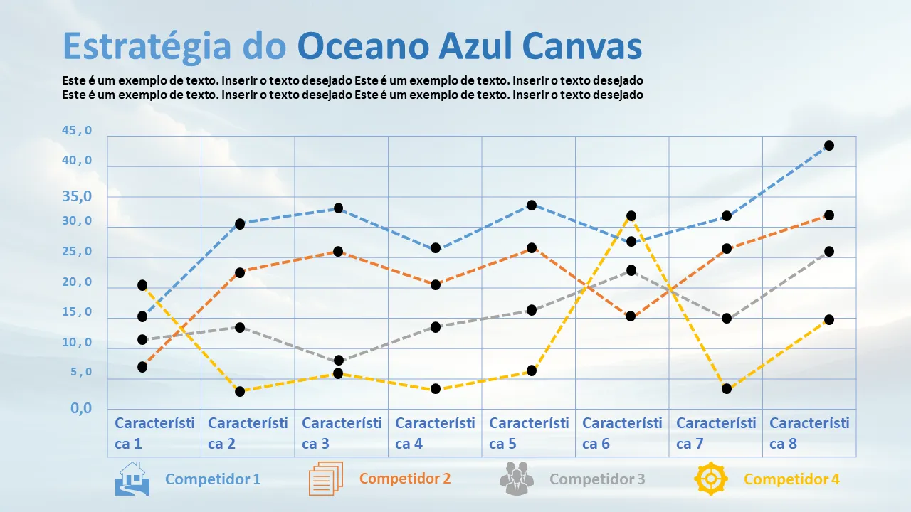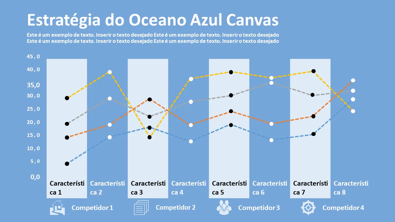 - Layout de quatro quadrantes alinhado aos princípios da Estratégia do Oceano Azul para facilitar o mapeamento da criação de valor e da estrutura de custos