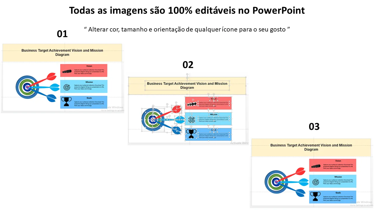 Características de Modelos de Powerpoint de diagrama de visão e missão de realização de metas de negócios