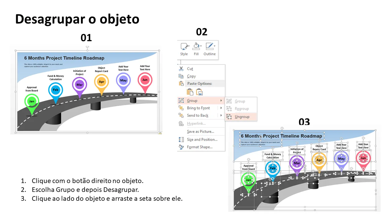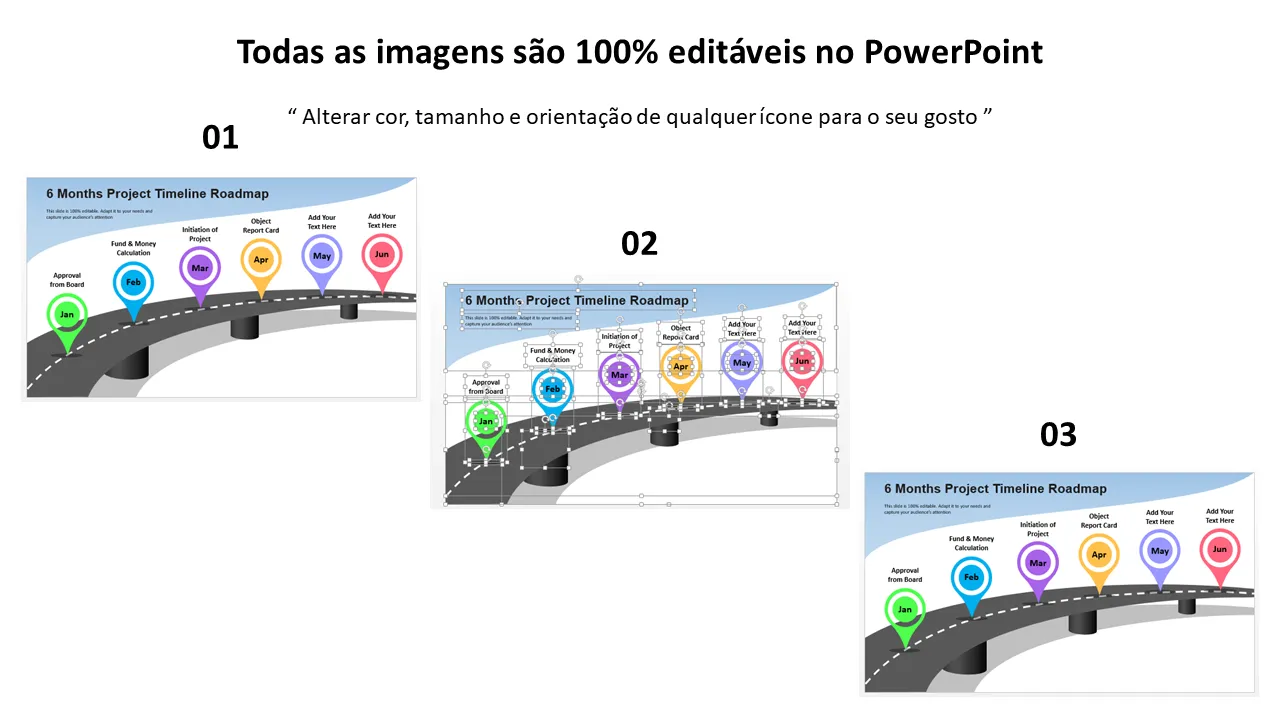 Este modelo profissional do PowerPoint fornece um roteiro visual claro para planejar e acompanhar um projeto de seis meses. Criado para oferecer clareza e impacto, ele ajuda as equipes a mapear as principais fases, marcos e resultados em um formato de cronograma estruturado. Ideal para gerentes de projetos, executivos e equipes multifuncionais, esta ferramenta de planejamento de roadmap oferece suporte ao alinhamento estratégico e à comunicação transparente entre departamentos.