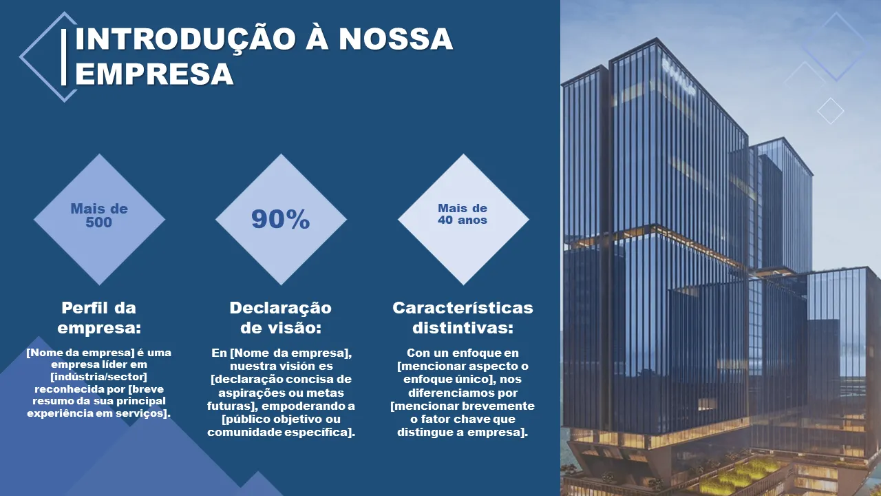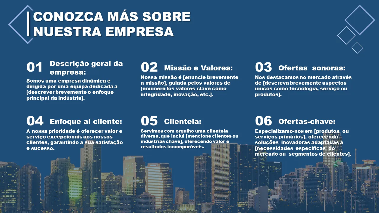 - Seções pré-projetadas para missão, visão e marcos da empresa