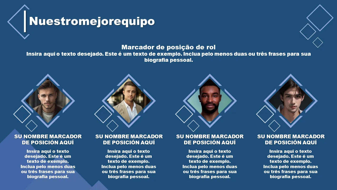 - Inclui um slide de destaque dedicado da equipe com marcadores de função