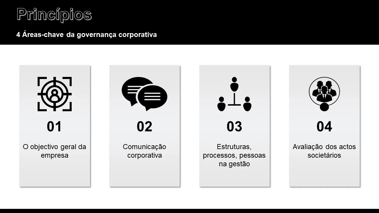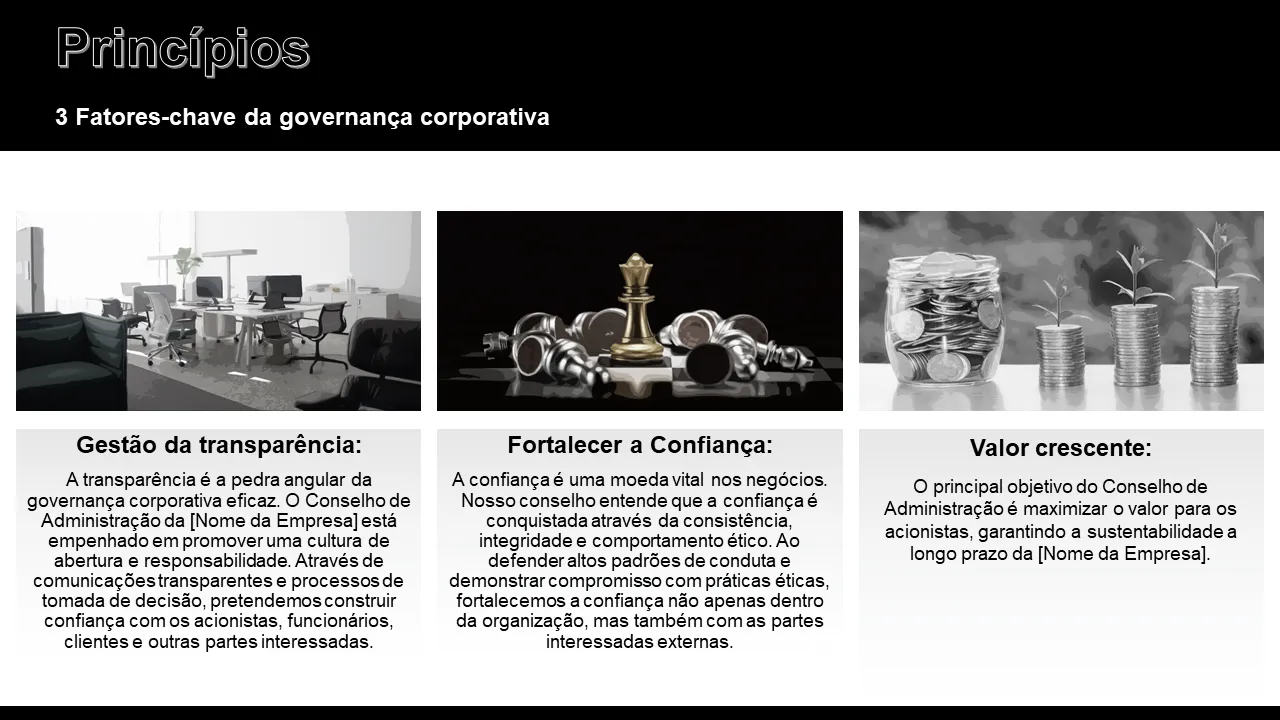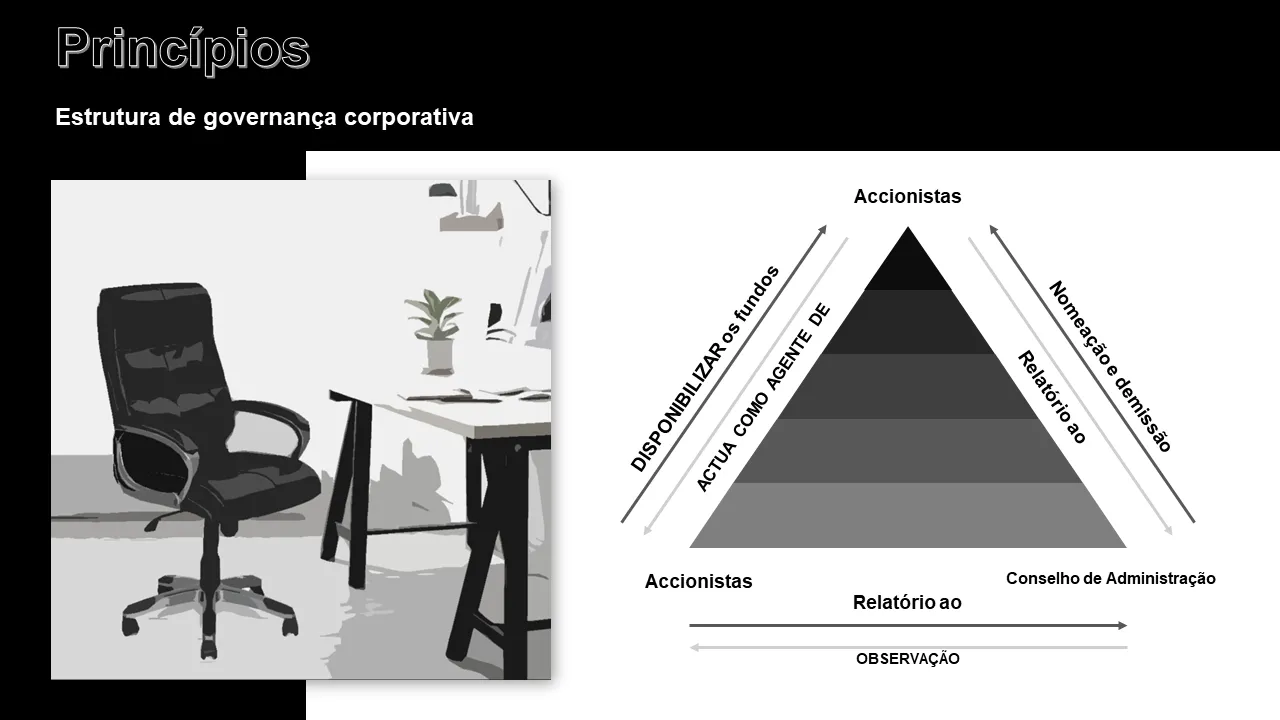 - Slides pré-projetados da estrutura de governança com hierarquia visual para funções e responsabilidades do conselho