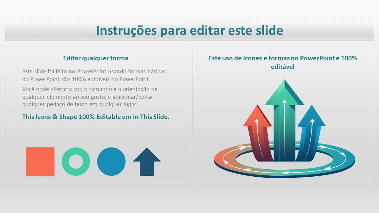 Este modelo de PowerPoint visualmente atraente usa três setas animadas para representar os principais conceitos estratégicos: crescimento, processo e adaptação. Ideal para apresentações focadas em planejamento estratégico, o modelo emprega motion design para reforçar mensagens importantes sobre impulso futuro, fluxos de trabalho cíclicos e mudanças responsivas. O layout é limpo e profissional, tornando-o adequado para públicos executivos e equipes de desenvolvimento de negócios.