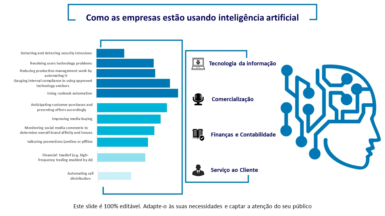 Os líderes empresariais usam este modelo para apresentar planos de transformação digital orientados por IA para investidores, salas de diretoria ou equipes multifuncionais. É adequado para setores como fintech, saúde e manufatura, onde a adoção da IA é crítica. Consultores e equipes de estratégia se beneficiam de seu layout estruturado para apresentações a clientes ou workshops internos. Ele também funciona para startups que buscam financiamento ou expansão por meio de inovação habilitada para IA.