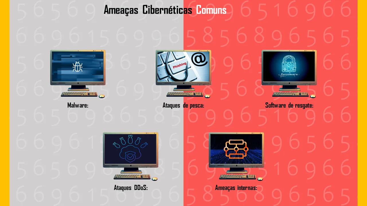 - Slides de comparação visual para ameaças cibernéticas, vulnerabilidades e controles